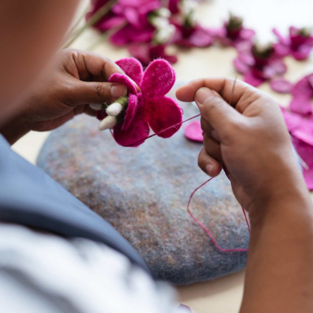 Deze Ridderspoor komt uit de viltcollectie van Sjaal met verhaal. In de steel is metaaldraad verwerkt, waardoor je de bloem in de gewenste vorm kunt buigen. Een duurzame, tijdloze decoratie die het goed doet in elk interieur.