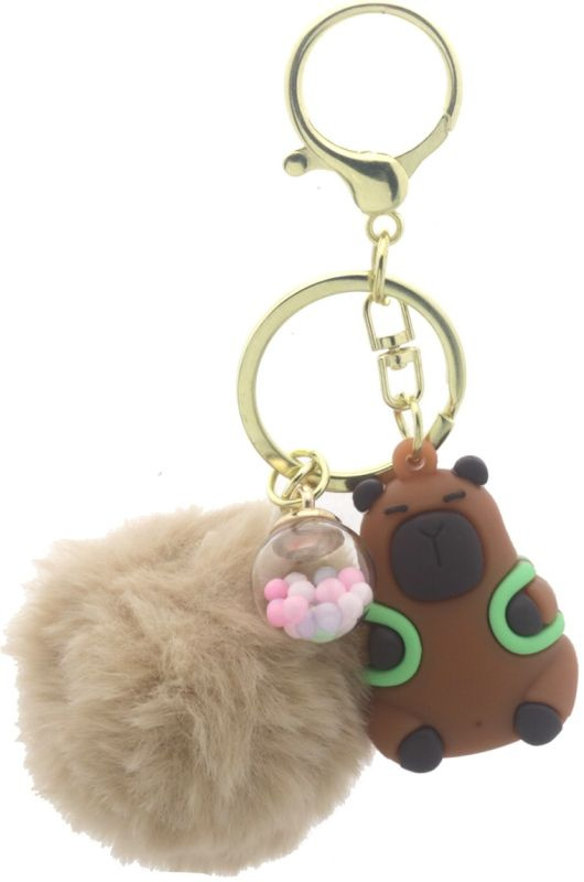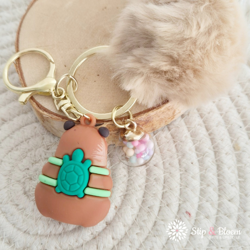 Deze supervrolijke keychain is geweldig voor aan je sleutelbos, maar doet het ook heel leuk als tashanger. Aan de goudkleurige sleutelring en karabijnhaak zit een zachte pompom, een transparant hangertje met daarin pastelkleurige bolletjes en een capibara met een schildpadrugzakje.